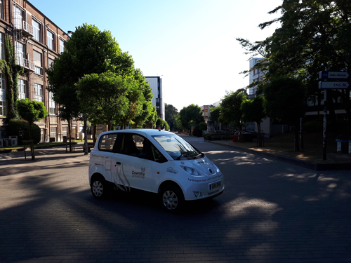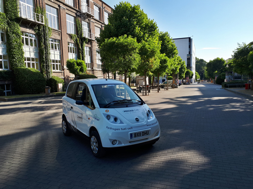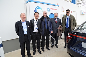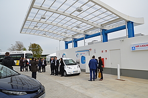 (Microcab FCEV in front of the Air Liquide refueling station, at the opening event)